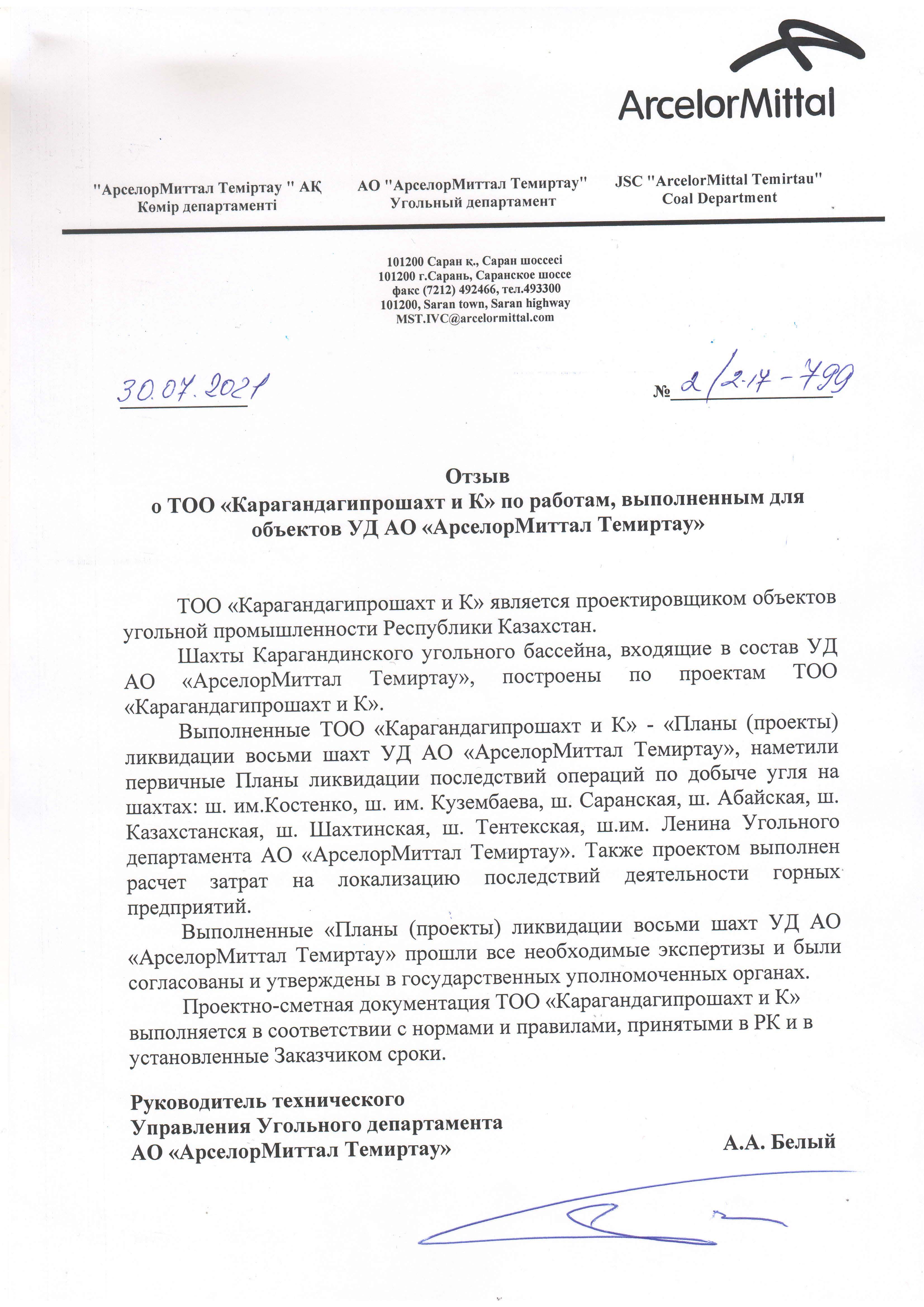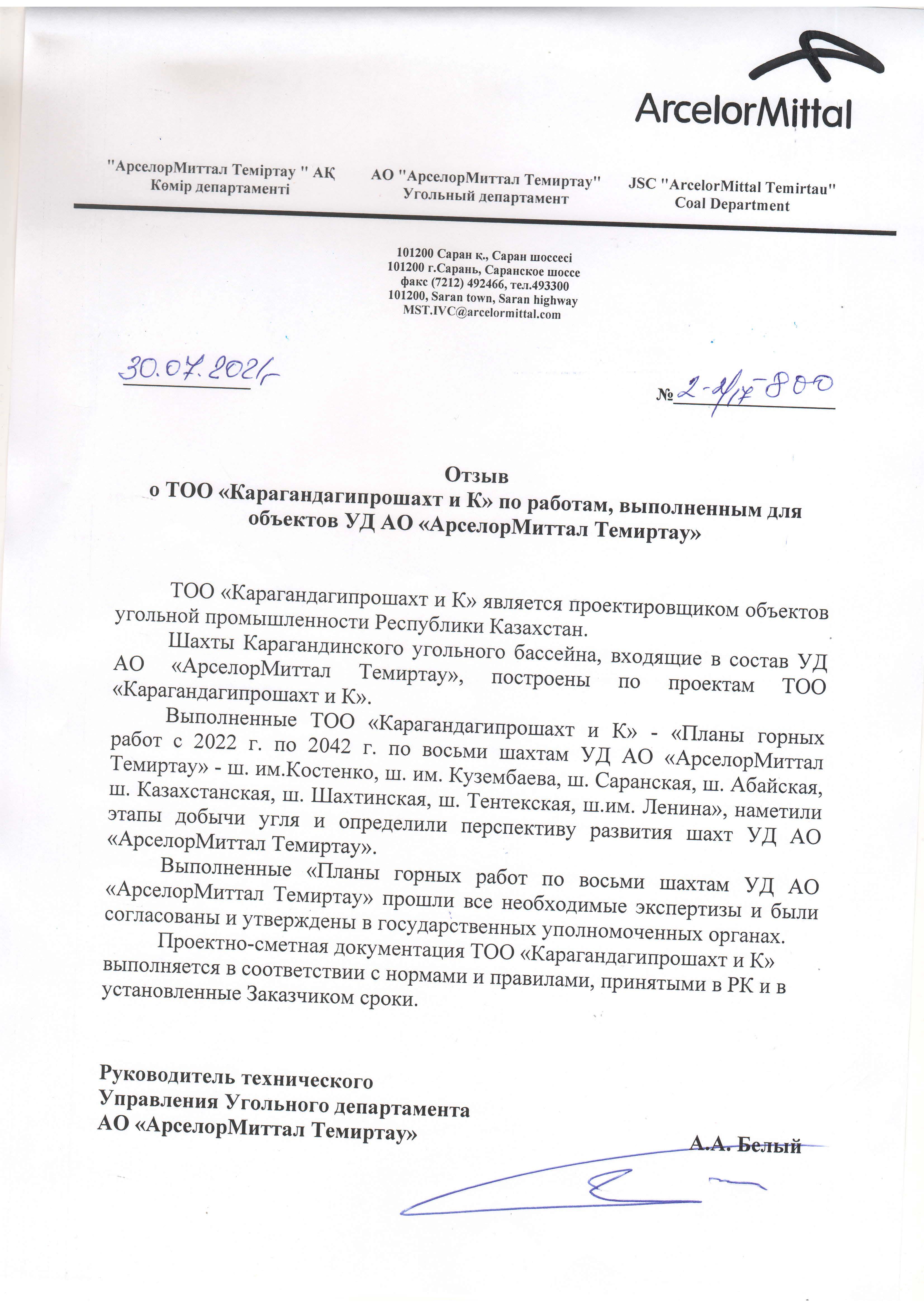 АО "АрселорМиттал Темиртау" 2021г.