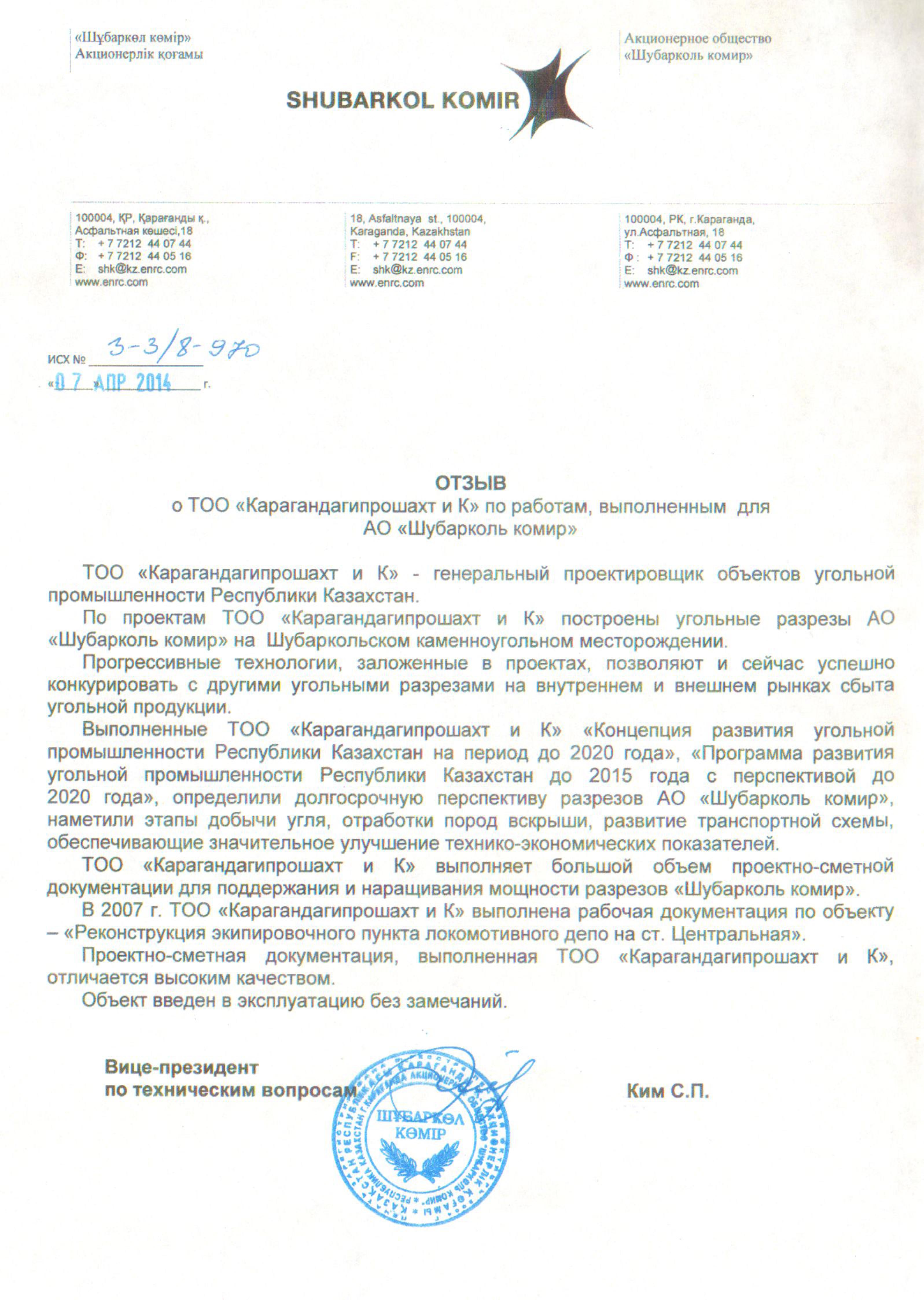 АО "Шубарколь комир" 2014г.